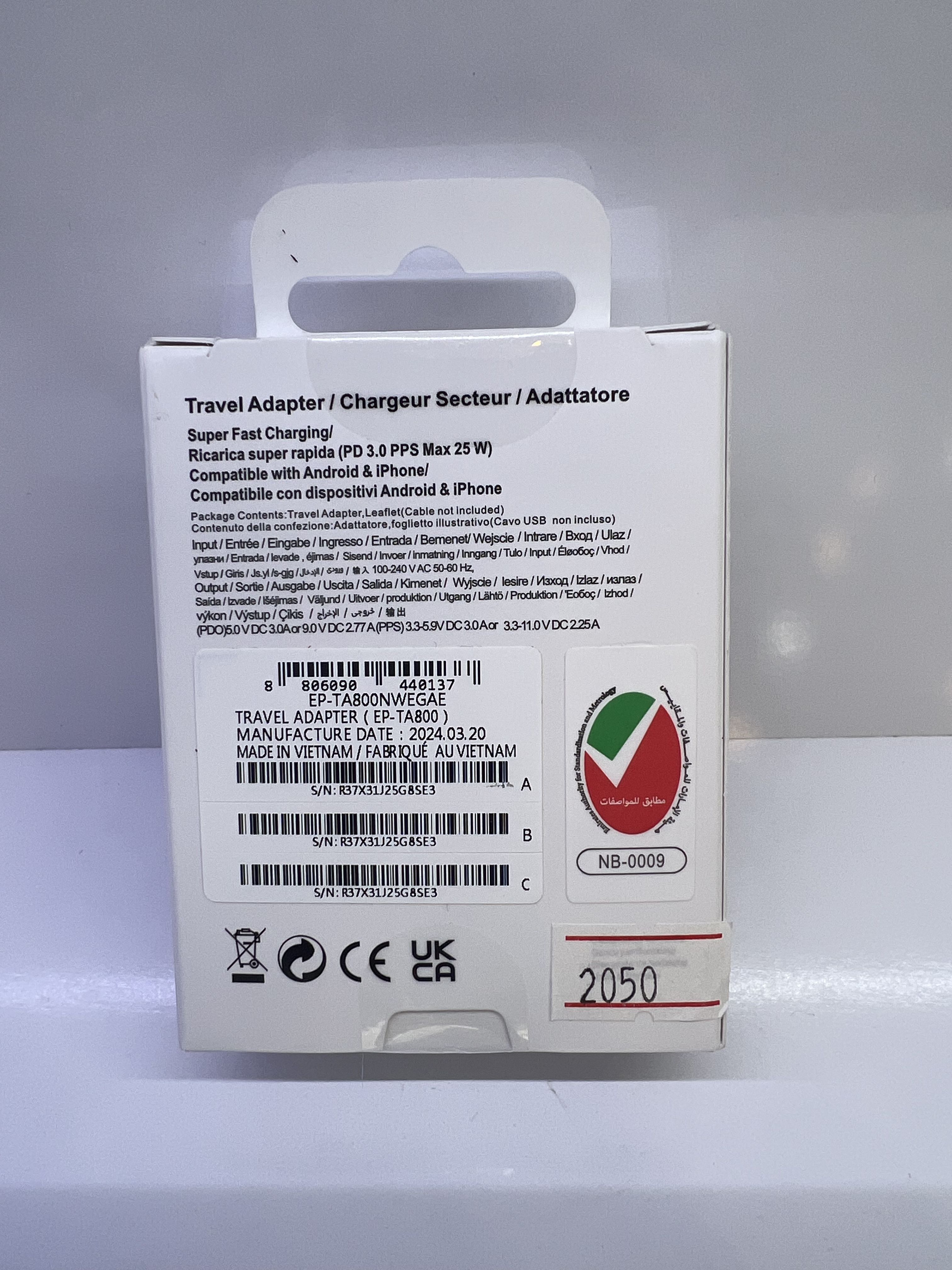 مصرف برق نزدیک به صفر در حالت استندبای / بیشترین میزان ولتاژ خروجی در حالت شارژ معمولی ۵ ولت - بیشترین میزان جریان خروجی در حالت شارژ معمولی ۳ آمپر / بیشترین میزان ولتاژ خروجی در حالت شارژ سریع ۹، ۵.۹ یا ۱۱ ولت - بیشترین میزان جریان خروجی در حالت شارژ سریع ۲.۷۷، ۳ یا ۲.۲۵ آمپر / ابعاد شارژر ۴۹x۲۷.۱x۶۸.۷ میلیمتر