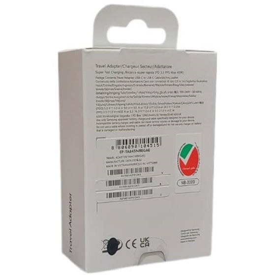 کله شارژر دیواری ۴۵ وات باقابلیت شارژر فوق سریع (توربو شارژ) بسیار باکیفیت درساخت وطراحی. قابلیت شارژ سری اس سامسونگ و گوشیهای با قابلیت شارژر توربو این شارژر ساخت کشور ویتنام می باشد.